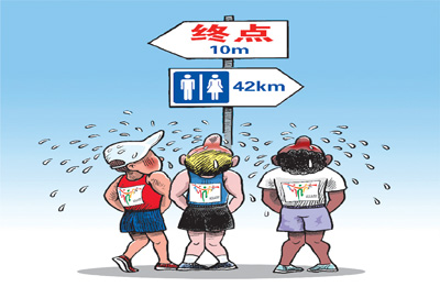 北京國際馬拉松賽上,沿途沒什么衛生間,組織方提供的流動廁所又少,很多選手被迫在賽道旁的墻根或綠化帶中解決,甚至有內急的男同胞“占領”女廁。有市民表示,“成功的賽事,不單是賽事順利舉辦和成績的突破,還應該有周到的服務和良好的氛圍”。