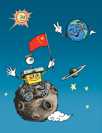 北京時間12月14日21時11分,嫦娥三號探測器在月球表面預選著陸區域成功著陸,次日4時35分,“玉兔號”巡視器與嫦娥三號成功分離,順利駛抵月球表面,并開展一系列就位探測和巡視勘察活動。這標志我國已成為世界上第三個實現地外天體軟著陸的國家。這正是: