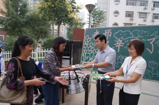 今天是第二十九個教師節,濟南市新世界小學的領導提前來到學校門口,迎接老師們的到來,共慶自己的節日。全體教師收到了學校送上的一本書和一句深情的問候。形式雖然簡樸、禮物雖然價值不高,卻讓老師們感受到了來自學校最真誠的感激和節日祝福。