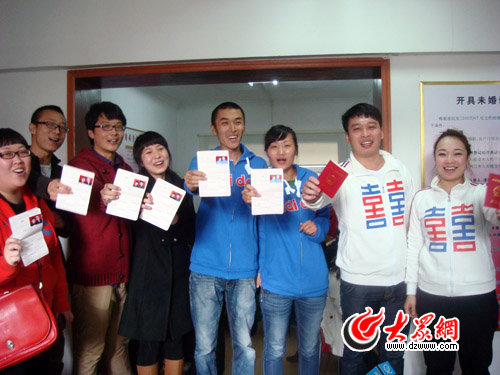 2011年11月11日11點11分,四對新人在歷下區婚姻登記管理處領取結婚證。