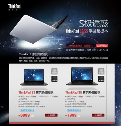 ThinkPad S3/S5山東首發活動:6月10日 青島CBD萬達廣場中庭;6月15日,濟南魏家莊萬達廣場西側中庭。凡在活動當日購買ThinkPad S3/S5的顧客,均可享受兩重浮游驚喜: