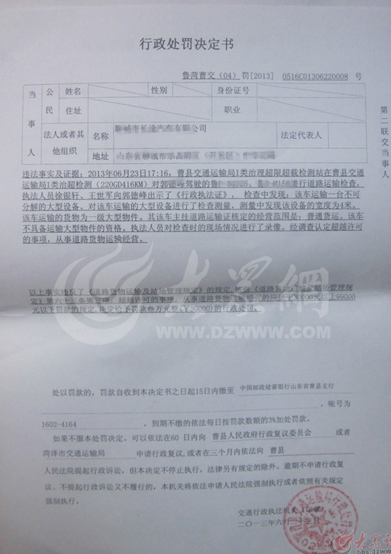 在帖子所附的《行政處罰決定書》上,大眾網記者看到,關于違法事實及證據一項寫著:檢查中發現,該車運輸一臺不可分解的大型設備。對該車運輸的大型設備進行了檢查測量,測量中發現該設備的寬度為4米。該車運輸的貨物為一級大型物件。該車主《道路運輸證》核定的經營范圍是:普通貨運。該車不具備運輸大型物件的資格。以上事實違反了《道路貨物運輸及站場所管理規定》的規定,依據《道路貨物運輸及站場管理規定》第六十三條第三項:超越許可的事項,從事道路貨物運輸經營的應處以30000元以上99000元以下罰款的規定,決定給予處罰款叁萬元整(¥30000)的行政處罰。在《同意分期(延期)繳納罰款通知書》上則寫明,罰款分兩期交,第一期為12500元,第二期為17500元。
