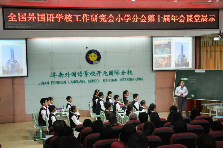 19日下午,濟南外國語學校開元國際分校向與會的專家、領導和嘉賓展示了三節特色鮮明、精彩異呈的英語課堂教學。其中,張莉莉老師執教的是繪本故事《A Big, Big Day》。扎實的語音教學,培養學生“見詞能讀,聽音知形”這種自然拼讀的能力,拓展延伸提升了學生的文化意識。由齊文姿老師執教的高年級英語閱讀辯論課,閱讀、思考與辯論同堂,激活思維,開啟智慧的天窗,實力演繹了過腦走心與真實運用相結合的英語課堂。曹艷老師則執教了一節閱讀拓展課,通過對家鄉濟南的介紹,將“四面桃花三面柳,一城山色半城湖”的特點呈現在了學生面前,將立體式閱讀、賞析式閱讀、任務式活動和拓展閱讀、進階式評價多方融為一體,真正體現了濟外英語教學的鮮明特色。