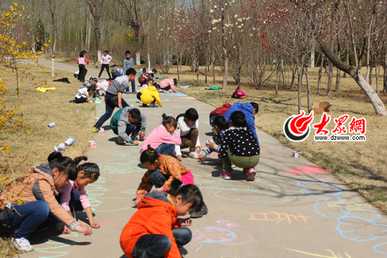 孩子們在植物園的道路上用粉筆作畫