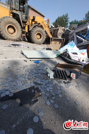 兩臺挖掘機轟鳴,400臺賭博游戲機成為垃圾。(曹亮 攝)