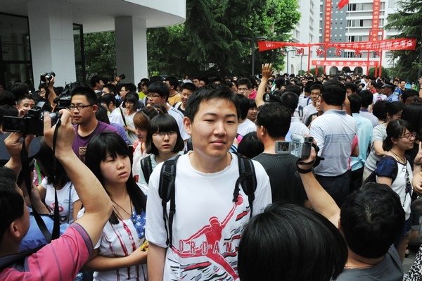 “出來了!出來了!”隨著考試結束鈴聲的響起,有不少考生開始往校門口走來。在外等候的人群中也響起陣陣掌聲,向剛剛走出“戰場”的考生們致敬。