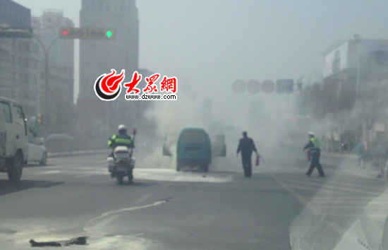 今天中午,濟南經十路上一輛面包車自燃,一名公交車司機與交警一起將火撲滅。(網友提供)