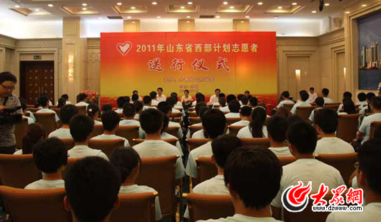 大眾網濟南7月25日訊(記者 趙洪棟)7月25日下午,2011年山東省西部計劃志愿者送行儀式在山東大廈隆重舉行。共青團山東省委書記王磊、共青團中央志愿者工作部副部長郭美薦等領導,以及120名即將奔赴新疆的2011年我省西部計劃首批志愿者出席了送行儀式。
