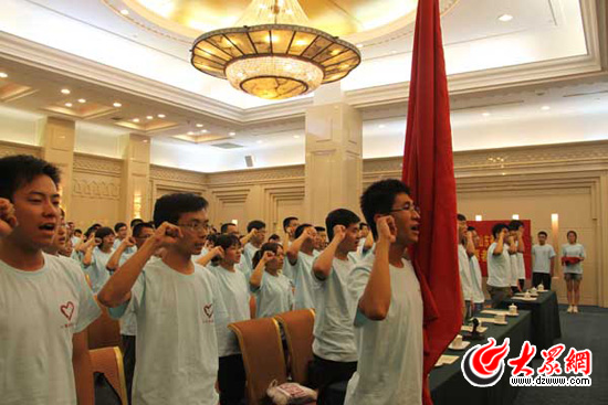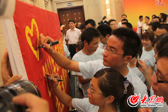 儀式上,志愿者們集體莊嚴宣誓,立志牢記責任,不辱使命,全力以赴,在服務西部的大舞臺上奉獻熱情、揮灑激情、展現風采。高校老師代表和志愿者家長代表為2011年山東省西部計劃志愿者送上了情真意切的祝福和寄語。儀式結束后,與會領導、志愿者在2011年西部計劃志愿者服務隊隊旗上簽字留念。