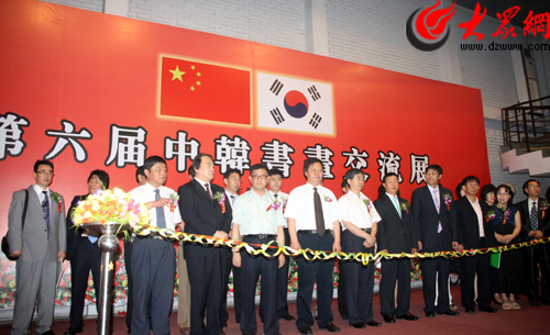 大眾網濟南6月22日訊(記者 趙永剛)今天上午,第六屆中韓書畫交流展在濟南東方現代藝術館開幕。省委宣傳部副部長、省文博會組委會副主任徐向紅,濟南市副市長張宗祥,濟南市政協副主席王可敏,濟南市原政協副主席、濟南市文聯主席吳澤浩和韓國水原市文化福祉委員會委員長金鐘基、韓國水原市書法協會會長盧福煥一行及社會各界人士200多人出席了開幕式。開幕式上,韓國水原書法協會向中國地震災區捐款1萬元人民幣。