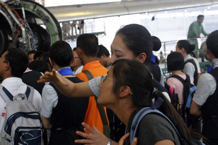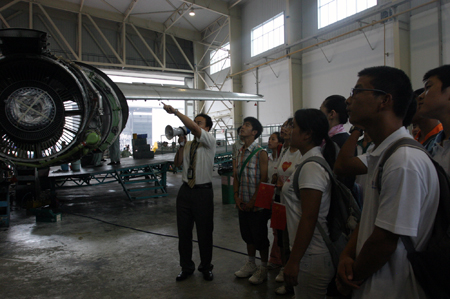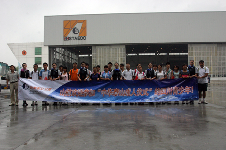 大眾網(wǎng)濟(jì)南7月8日訊(記者 王云峰)來自四川省北川縣的20名中學(xué)生今天下午乘坐飛機(jī)到達(dá)濟(jì)南,準(zhǔn)備參加明天在泰山舉行的“我自立 我自強(qiáng)——中華泰山成人儀式”。一走下飛機(jī),他們就受到了熱烈的歡迎,在山航太古維修機(jī)庫,孩子們第一次近距離了解了飛機(jī)的構(gòu)造和原理。