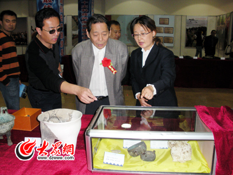 24日,長島縣在省科技館舉行“科學發展在長島”招商旅游推介展覽,圖為解說員向參觀者介紹長島出土的部分文物