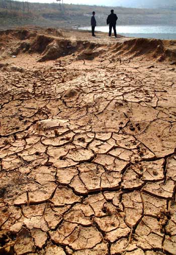 Part of the bed of a small reservoir near Jinan, Shandong Province, is seen dried-up November 16, 2006. Water in the reservoir is only one twentieth of the normal storage, as the most severe drought in the past thirty years prevails in the eastern province, leaving two million people temporarily short of drinking water.