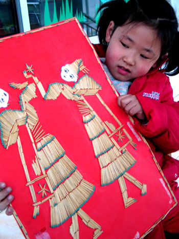 A child displays a greeting card she made at a kindergarten in Zouping, east China's Shandong Province January 25, 2007. She and other studetns of the kindergarten made cards with rags, colored papers, and matches to celebrate the upcoming Lunar New Year. |