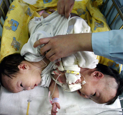 A nurse holds a pair of conjoined twins from Shangdong province in eastern China at a ward of a hospital in Shanghai April 5, 2007. The twins, born on January 30 this year, are joined at most parts of the liver and the lower part of the breastbone. They are waiting for surgery operations at the hospital. [Xinhua]