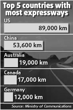 There are currently 53,600 km of expressways traversing the country - the second longest in the world behind the United States, which has 89,000 km.