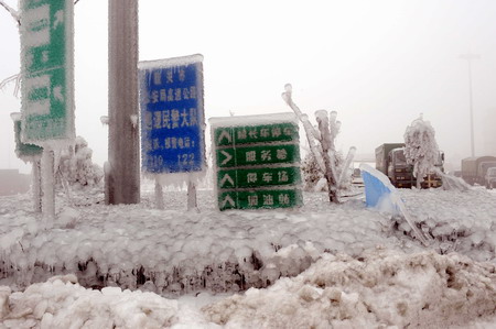 Ice and frost cover road signs and shrubs beside the Beijing-Zhuhai Expressway in Shaoguan, South China's Guangdong Province, February 2, 2008. [Xinhua]