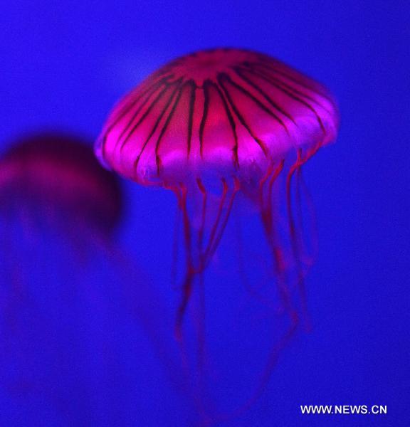 | Jellyfish float through their basin at Qingdao Aquarium in Qingdao, east China's Shandong Province, May 15, 2011. The Aquarium presents four different species of jellyfish as of now. (Xinhua/Niu Shupei) |