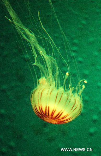| A jellyfish floats through its basin at Qingdao Aquarium in Qingdao, east China's Shandong Province, May 15, 2011. The Aquarium presents four different species of jellyfish as of now. (Xinhua/Niu Shupei) |
