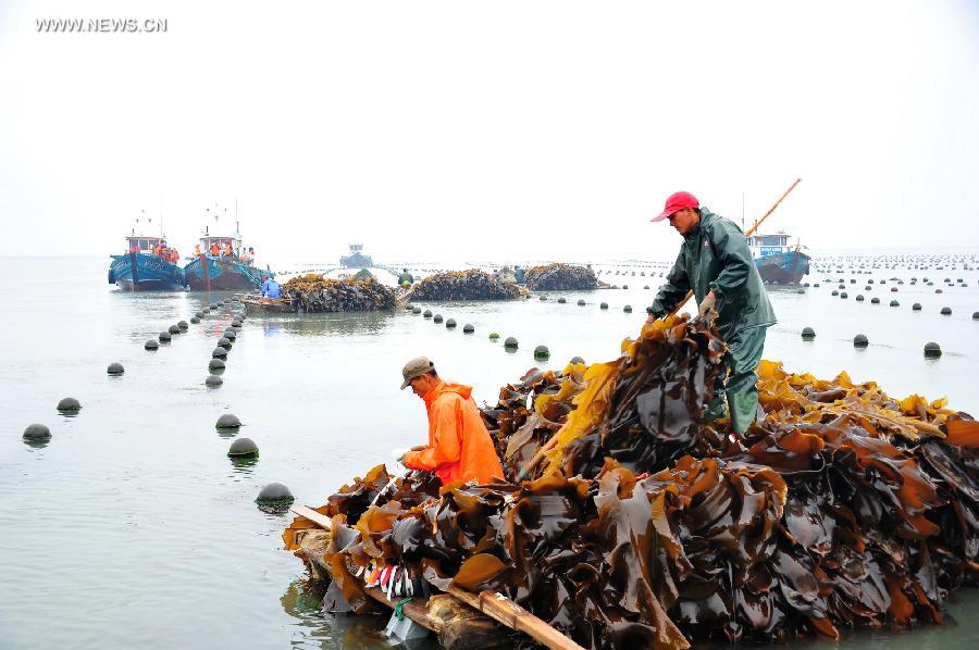 Workers harvest seaweeds off the coast of Rongcheng, east China's Shandong Province, June 1, 2014. In Rongcheng, workers are busy collecting edible seaweeds as the harvest season arrives. Rongcheng is a major planter and producer of edible seaweeds in China, turning out over a half of the country's seaweed products annually. (Xinhua/Ren Mengxue)