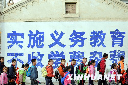 上學不用交費了——甘肅省臨澤縣第一小學學生放學回家。 新華社記者張錳攝