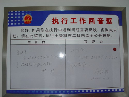 日前,章丘法院執行局在大廳門口設立“執行工作回音壁”,以方便當事人和執行法官之間的交流,接受外界監督,促進執行案件更加快速、公正地辦理。當事人對案件處理存在意見的,可以將反映的問題寫在回音欄內,涉案干警必須在兩日內公開回復,與當事人進行執行對話,對當事人提出的問題做出解答,并就相關情況向領導作出匯報。該項措施是章丘市人民法院六項執行公開措施促公正執法活動內容之一,已經收到了良好的社會效果。