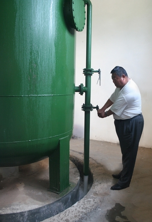 圖3:工作人員定期清理水處理罐。通過離心泵將蓄水池的水送到水處理罐,進(jìn)行除鐵、錳、雜質(zhì)、殺菌等工序,最后將達(dá)標(biāo)水通過供水主管道輸送到農(nóng)戶家中。