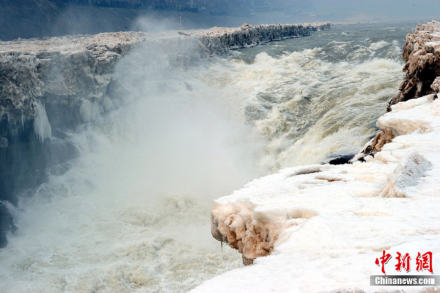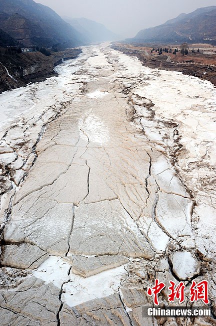 2月12日,來自西安游客站在吉縣一側黃河壺口冰封撕裂層面上拍照留念。近日,隨著氣溫的回升,封凍月余的黃河壺口瀑布開始消融,形成一條30多米長、10多米寬的壺槽,給初春的壺口瀑布帶來勃勃生機。中新社發袁景智 攝 圖片來源