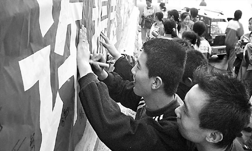 昨天上午,“許振超”這個響亮的名字振奮著每位趕來參加“藍 領(lǐng)”專場洽談會的人。“學(xué)習(xí)許振超,做新時期的技能人才”,長12 米、寬1米的鮮紅標語懸掛在洽談會現(xiàn)場,前來應(yīng)聘的學(xué)生不約而同 地提筆在條幅上簽下自己的名字。濟南市副市長王以才、本報副總編 輯周京臣也在條幅上簽了名。 到了下午3點多,橫幅上面已全是密密麻麻的名字。 |