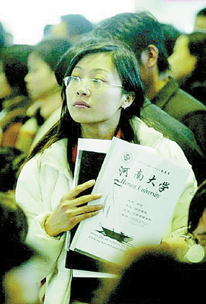 10日,在青島山東路人才市場上,一位河南大學的女學生抱著一摞個人推薦材料,準備向招聘人員推薦自己。