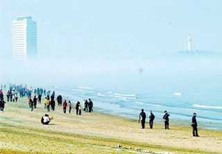 據介紹,在煙臺市區海岸出現“海市”奇觀尚屬首次。估計是近來氣溫回升,市區空氣稀薄,而異地景物被陽光折射后,恰好造成適宜的角度,又經不同密度空氣層傳遞折射所致。  (煙晚)