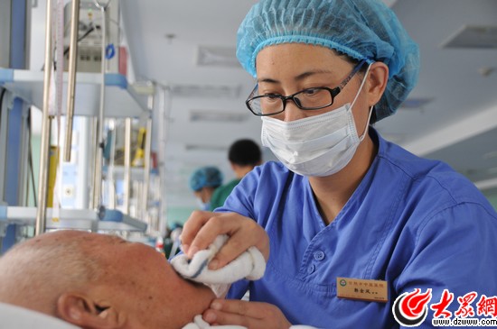 日照市中醫醫院腦病三科重癥監護室(ICU)里,幾乎全是這樣的病號。護士郭金鳳,已經在這里工作了8年多。因為臟、累,8年間,ICU的護士換了很多,可郭金鳳一直堅守在這最臟最累的地方,把自己的青春獻給了ICU這一特殊的護理崗位。
