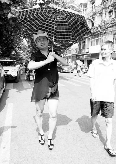 昨天上午,當記者在司門口偶遇李明時,他正踩著近12厘米的高跟鞋,著裝也十分女性化。這樣的裝扮,讓過往行人紛紛向他行起了“注目禮”。