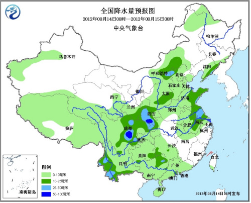 14日08時至15日08時,青藏高原、新疆西南部、西北地區(qū)東部、內蒙古中部和東北部、東北地區(qū)南部、華北、黃淮、江淮、西南地區(qū)、江南西部、華南等地有小到中雨或雷陣雨,其中,陜西南部、四川盆地西部、重慶北部、內蒙古中部、河北西北部、遼寧東部、山東東南部、江蘇中部、云南西部和南部等地的部分地區(qū)有大雨,局地暴雨(50~90毫米),上述部分地區(qū)并伴有雷暴大風等強對流天氣。