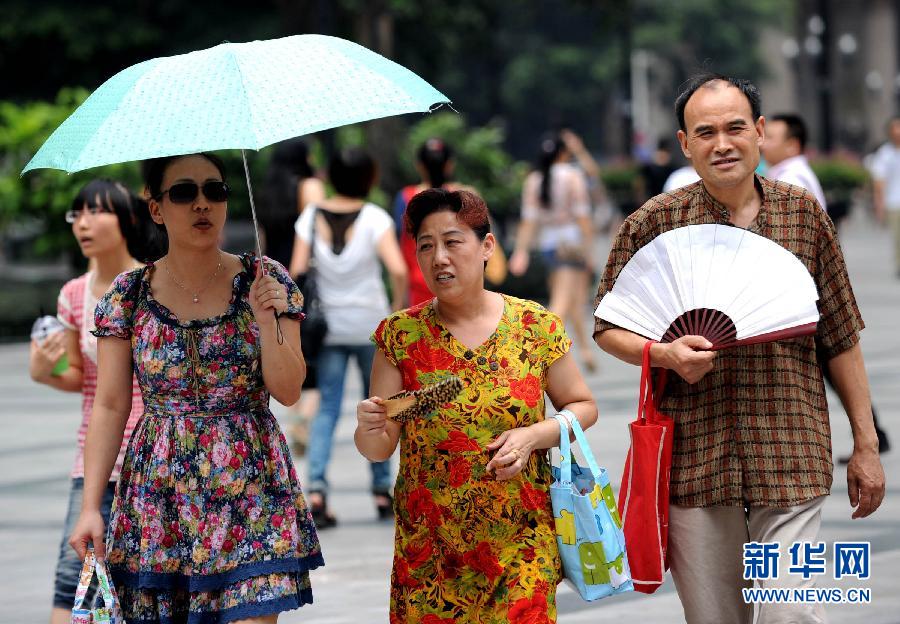 8月13日,幾位市民冒著高溫在解放碑逛街。連日來(lái),素有“火爐”之稱(chēng)的重慶市遭遇持續(xù)高溫天氣,最高氣溫維持在35℃以上。重慶市氣象臺(tái)于13日11時(shí)50分再次發(fā)布“高溫紅色預(yù)警”信號(hào)。這也是繼12日后,重慶今年第二次發(fā)布高溫紅色預(yù)警。預(yù)計(jì)今天12時(shí)到18時(shí),該市潼南、渝北等地日最高氣溫將升至37℃以上,南岸、九龍坡、大渡口等地日最高氣溫將升至40℃以上。新華社記者 李健 攝