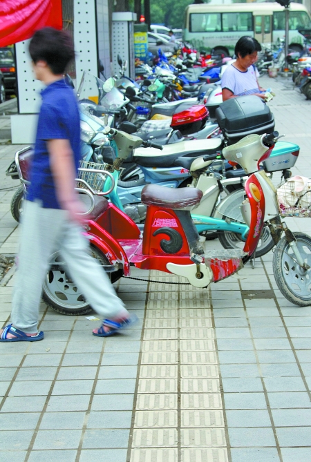 王府井門口盲道上停滿了非機(jī)動(dòng)車輛