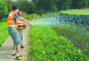 [提要] 在張師傅的指導下,我左手按壓著藥箱的把手,右手拿著的噴頭里便均勻地噴出了蟲藥。在橋區的另一塊綠地上,劉金堂師傅正在給草坪灑水,清澈的自來水從水管口噴出,在空中劃過一個漂亮的扇形。