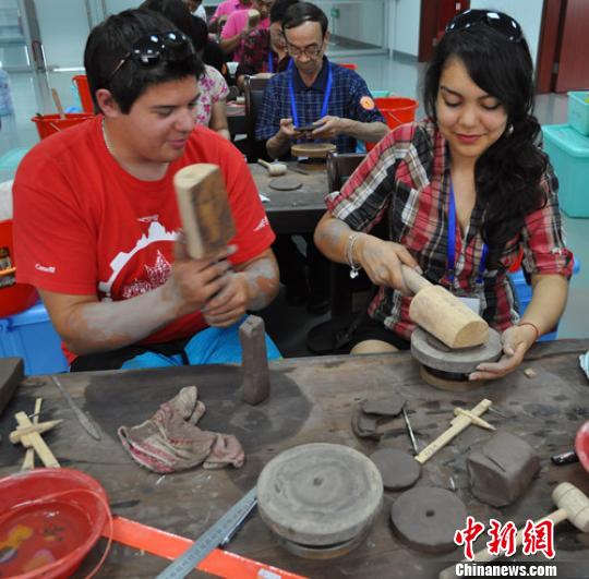 中新網無錫8月15日電(孫權)首屆APEC青年技能夏令營15日在無錫市公共實訓基地舉行了開營以來的第三站活動,來自APEC17個經濟體的99名青年技能夏令營營員捧起紫砂泥、拿起穿針線,在無錫親身體驗了一回紫砂壺、錫繡、惠山泥人等中國特產的傳統制作工藝。