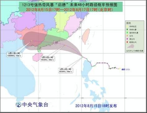 中央氣象臺監測,“啟德”于17時進入南海東北部海面,目前距離廣東省深圳市750公里(北緯19.2度,東經120.3度),中心附近最大風力有10級(28米/秒),中心最低氣壓為985百帕。預計,“啟德”將以每小時20~25公里的速度向廣東沿海靠近,強度繼續加強,并將于16日晚上到17日白天在廣東惠來到湛江一帶沿海登陸,登陸時強度可能為臺風(12級)。