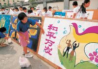 在10公里海濱觀光大道上,10多個國家的萬名兒童以和平為主題創作的萬米書畫長廊