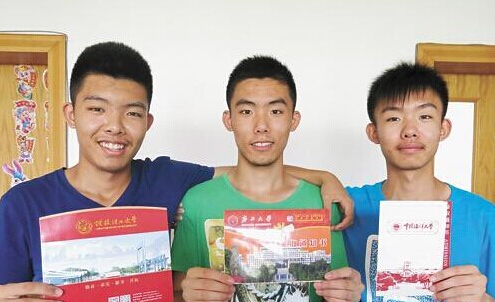 三胞胎兄弟老大、老二、老三分別叫張志文、張志武、張志豪。在今年的高考中,老大張志文以551分的分數被桂林理工大學自然地理與資源環境專業錄取,老二張志武以617的高分被廣西大學錄取,學習電子商務專業,老三張志豪則通過自主招生順利考入中國海洋大學,學習海洋技術專業。其中廣西大學和中國海洋大學都是211重點大學,桂林理工大學也是二類本科中不錯的院校!昂⒆觽兌掠趾脤W,考上大學可是不容易了!”三兄弟同時考上大學,姥姥高麗鳳既興奮又自豪。