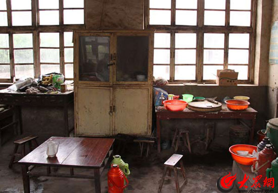 土洼小學現在的校舍建于1976年,由于年久失修,房屋都已經很破舊,學校的負責人告訴記者,除后面的一排教室加過天花板,前面的辦公室、教工值班宿舍等基本沒有維修過,辦公室的地面上還殘留著漏雨留下的雨痕。教室里的桌椅也是建校時添置的,上面的油漆已經斑駁脫落,有的桌洞上已經裂開了大洞。夏蔚鎮中心校的劉青松校長說,土洼小學現在是夏蔚鎮條件最差的教學點,由于學生太少,已經沒有翻修的必要,但這里離其他學校又實在太遠,把孩子轉到其他學校去,孩子上學也不方便,土洼小學還只能這樣維持下去。