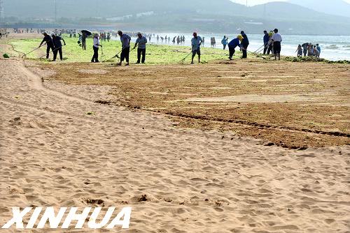 7月17日,工人在金沙灘海水浴場清理滸苔。經過連日清理,目前滸苔已明顯減少。