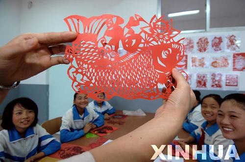 7月19日,在威海市經濟開發區崮山中學鄉村少年宮,老師在教同學們剪紙。新華社記者 郭緒雷 攝