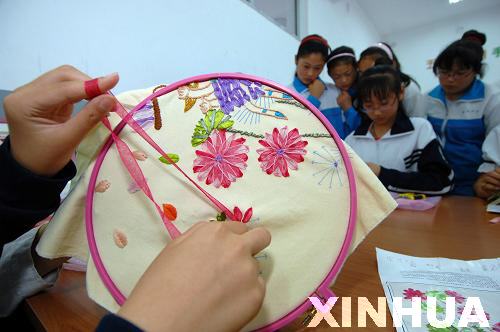 7月19日,在威海市經濟開發區崮山中學鄉村少年宮,同學們在學習絲帶繡。新華社記者 郭緒雷 攝