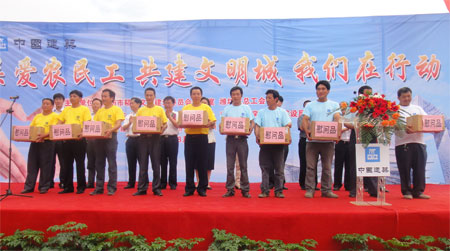 新華網山東頻道8月8日電 8月6日上午,位于濰坊市高新技術開發區的中建三局大觀天下項目部呈現出一片歡樂景象。由濰坊市精神文明建設委員會辦公室、濰坊市總工會、濰坊市人力資源和社會保障局、濰坊市住房和城鄉建設局、濰坊市衛生局主辦,中建三局山東分公司承辦的 "關愛農民工、共建文明城、我們在行動"啟動儀式隆重舉行。