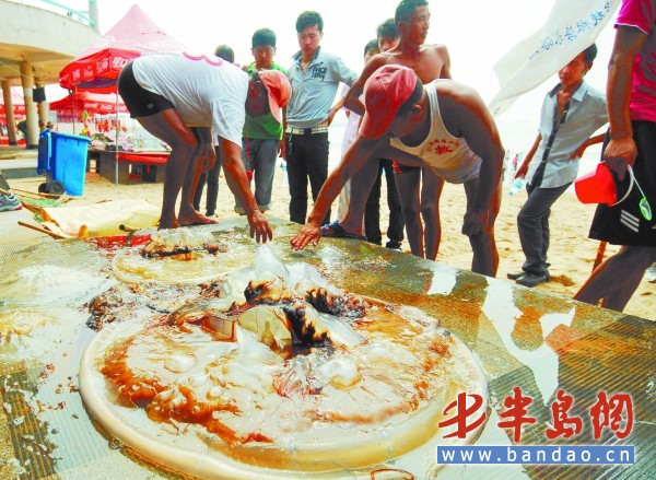 8月6日上午9時(shí)許,六浴工作人員劃船沿防鯊網(wǎng)巡查時(shí),撈上一只直徑一米半、體重100斤的巨型海蜇,1名救護(hù)隊(duì)員的胳膊被蜇傷;8月17日下午,一名游客在六浴游泳時(shí)發(fā)現(xiàn)一只大海蜇,直徑一米多,有50斤重。