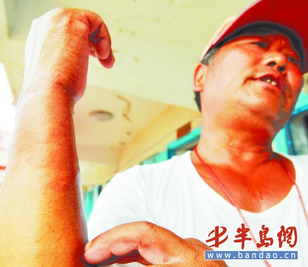 [提要] 救護(hù)隊(duì)員的胳膊被蜇傷。“我們這又撈上一只大海蜇,差不多有200斤。”9月1日上午,第六海水浴場(chǎng)救護(hù)隊(duì)員在巡邏時(shí)再次發(fā)現(xiàn)巨型海蜇,4名隊(duì)員費(fèi)了一番周折才把這個(gè)龐然大物弄上岸,其間3名救護(hù)隊(duì)員被意外蜇傷。
