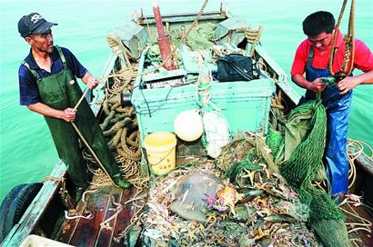 “這些個頭很大的都是沙海蜇,比起綿海蜇來口感差一些,也賣不上好價錢,也就1塊錢1斤吧。”薛光山說,今年的沙海蜇真是不少,如果單純捕撈沙海蜇的話,一天也能賣個1000來塊,可是拖網捕魚的時候,沙海蜇鉆進網里就不是好事了,它會將網托起,這樣就不能將海底的東西都撈上來,影響捕撈的效果。