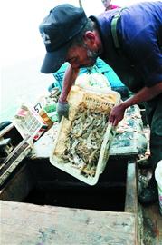 “要返航了,碼頭上的魚販子已經等著了。”到了下午4時,薛光山吆喝著,也加快了分揀海貨的速度。隨后他駕船回到甘水灣碼頭。記者看到岸上走來一個穿白衣的男子。“老薛,今天有什么好東西?”“有活立蝦、雜魚、蝦虎……”兩人互相吆喝著。